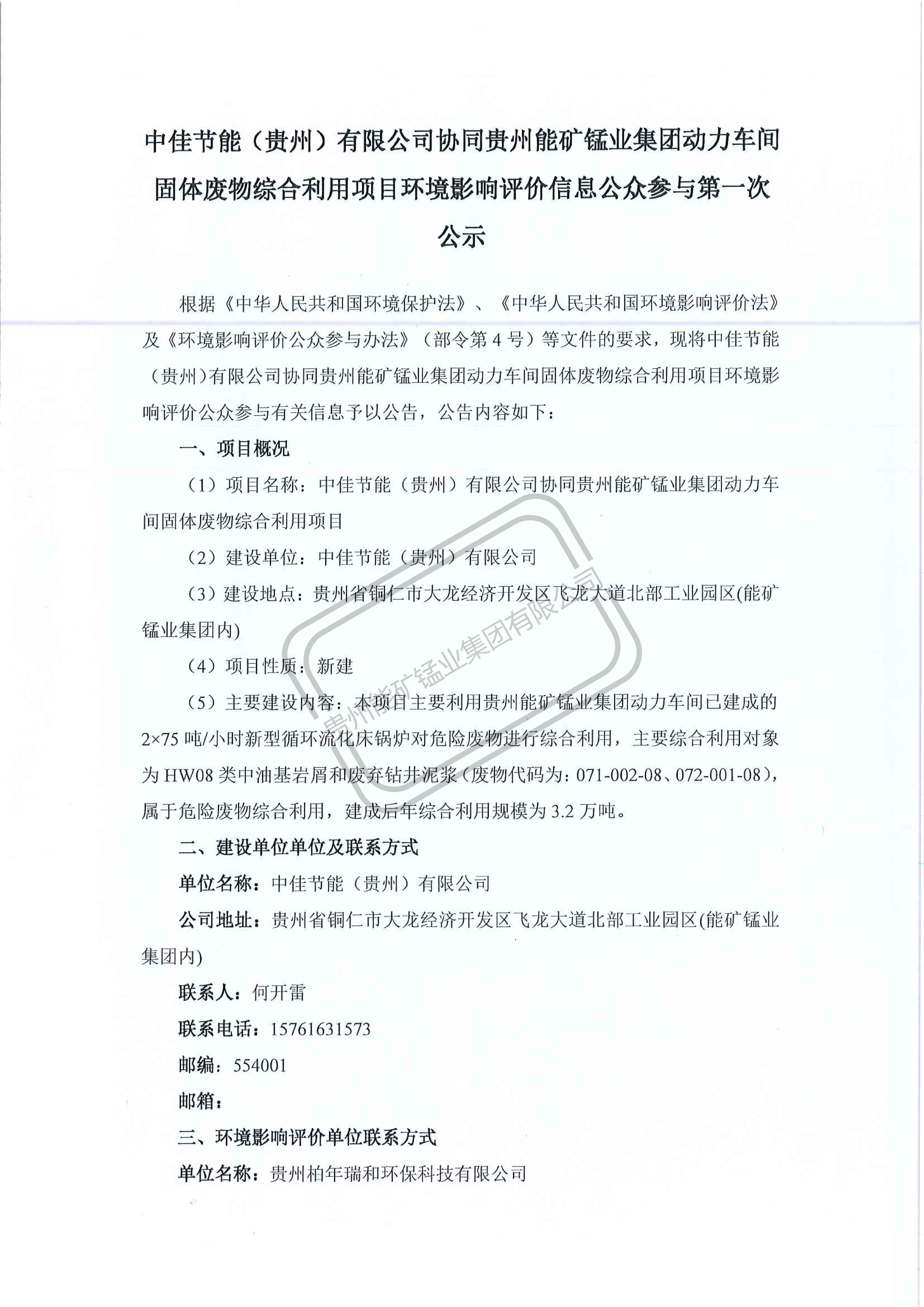 中佳節能(貴州)有限公司協同貴州能礦錳業集團動力車間固體廢物綜合利用項目環境影響評價信息公眾參與第一次公示